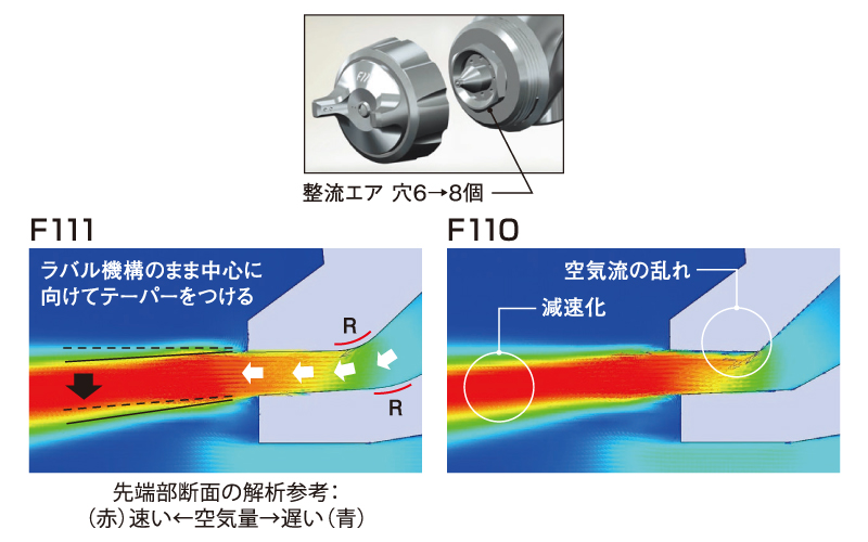 空気の流れる塗料ノズルと空気キャップ先端部にRを設定することで、空気のバタつきを低減しスムーズな流れで流速を維持、塗料噴出量の確保と微粒化性能を向上。