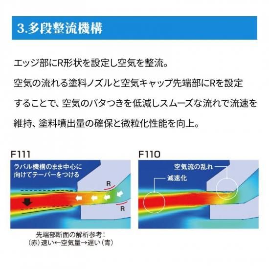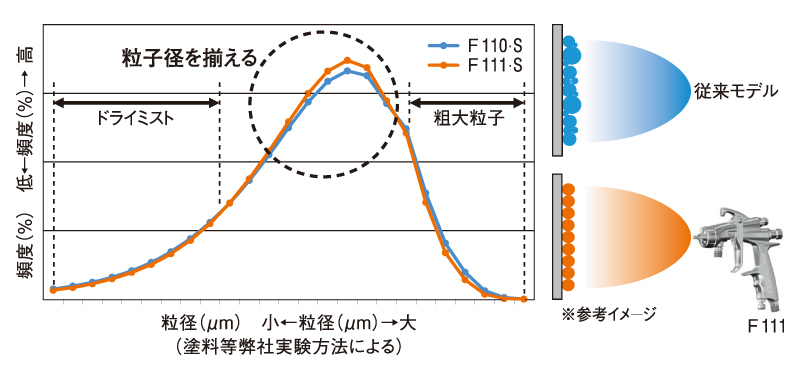 3つの技術が融合した新設計の塗料ノズルと空気キャップで、塗料噴出量・微粒化を維持したまま粒子径を揃えます。