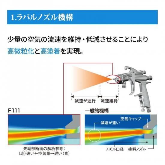 ・少量の空気の流速を維持・減速させることにより高微粒化と高塗着効率を実現。