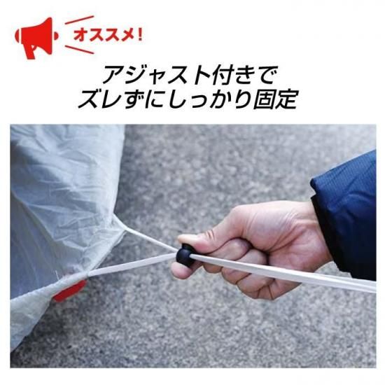 大型ワンボックスのタイヤまでスッポリ収まり、 アジャスト付きだから風にも強く耐久性アップ! ●被せるだけの簡単作業 ●アジャスト付きでズレずにしっかり固定 ●便利なセンターマーク付き
